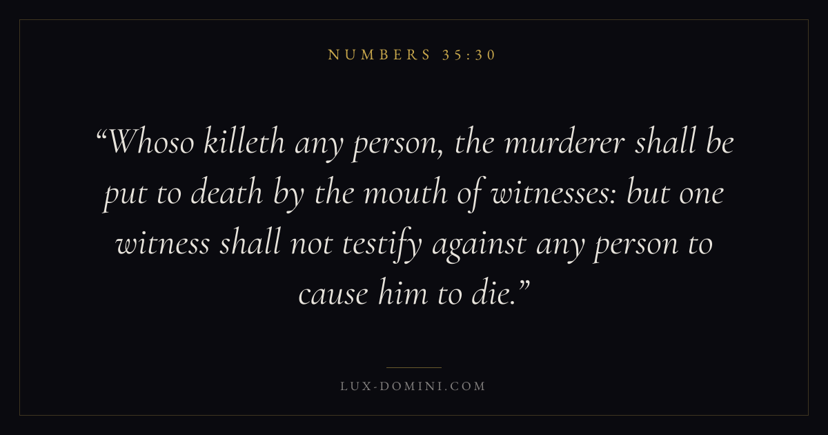 Whoso killeth any person, the murderer shall be put to death by the mouth of witnesses: but one witness shall not testify against any person to cause him to die.