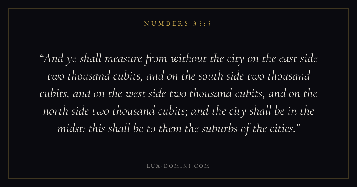 And ye shall measure from without the city on the east side two thousand cubits, and on the south side two thousand cubits, and on the west side two thousand cubits, and on the north side two thousand cubits; and the city shall be in the midst: this shall be to them the suburbs of the cities.