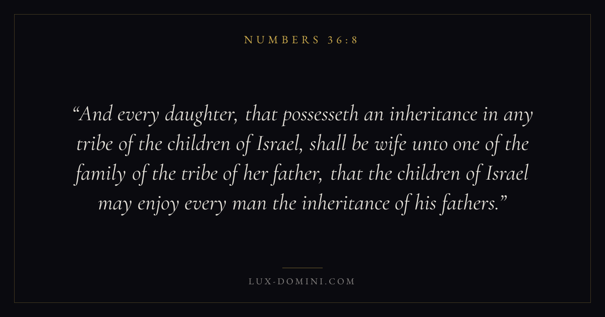 And every daughter, that possesseth an inheritance in any tribe of the children of Israel, shall be wife unto one of the family of the tribe of her father, that the children of Israel may enjoy every man the inheritance of his fathers.