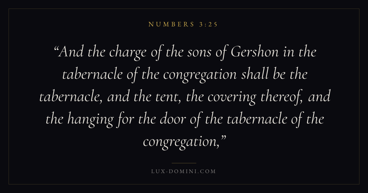 And the charge of the sons of Gershon in the tabernacle of the congregation shall be the tabernacle, and the tent, the covering thereof, and the hanging for the door of the tabernacle of the congregation,
