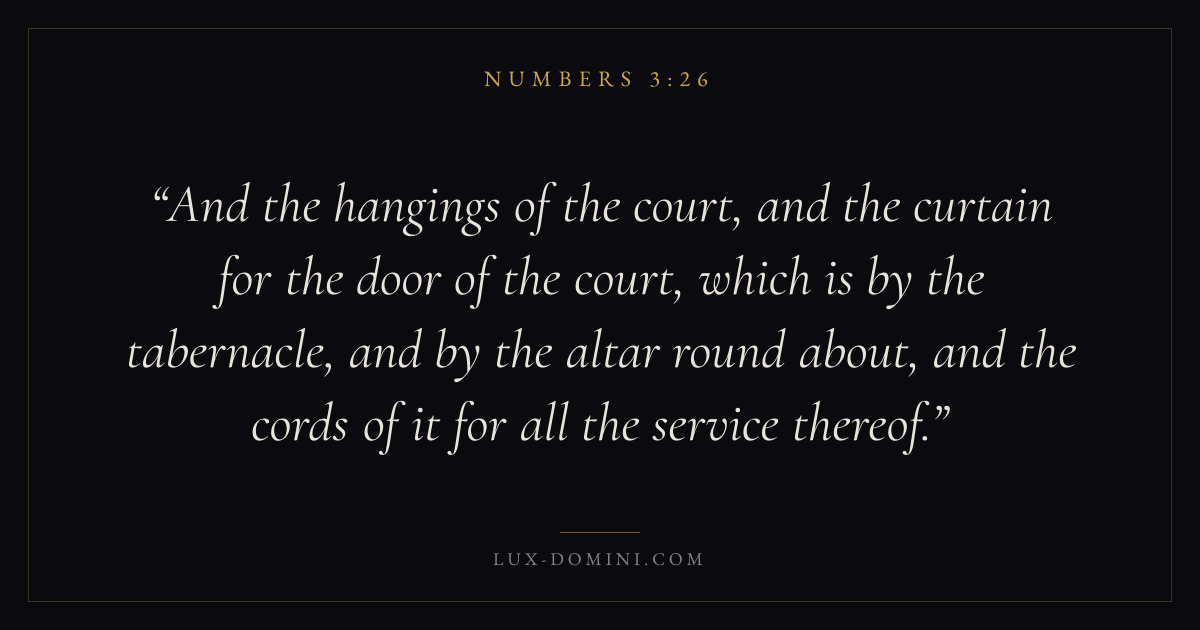 And the hangings of the court, and the curtain for the door of the court, which is by the tabernacle, and by the altar round about, and the cords of it for all the service thereof.