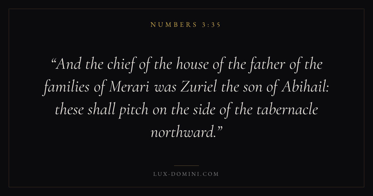 And the chief of the house of the father of the families of Merari was Zuriel the son of Abihail: these shall pitch on the side of the tabernacle northward.