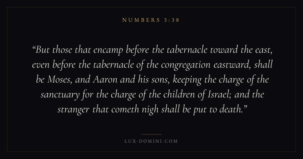 But those that encamp before the tabernacle toward the east, even before the tabernacle of the congregation eastward, shall be Moses, and Aaron and his sons, keeping the charge of the sanctuary for the charge of the children of Israel; and the stranger that cometh nigh shall be put to death.