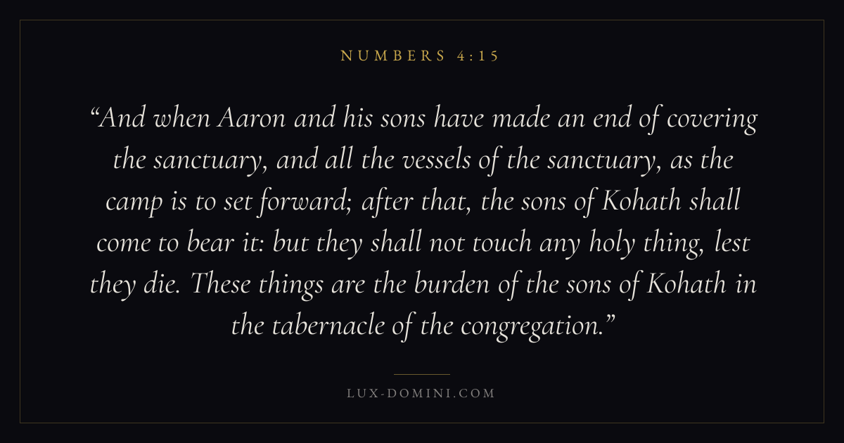 And when Aaron and his sons have made an end of covering the sanctuary, and all the vessels of the sanctuary, as the camp is to set forward; after that, the sons of Kohath shall come to bear it: but they shall not touch any holy thing, lest they die. These things are the burden of the sons of Kohath in the tabernacle of the congregation.