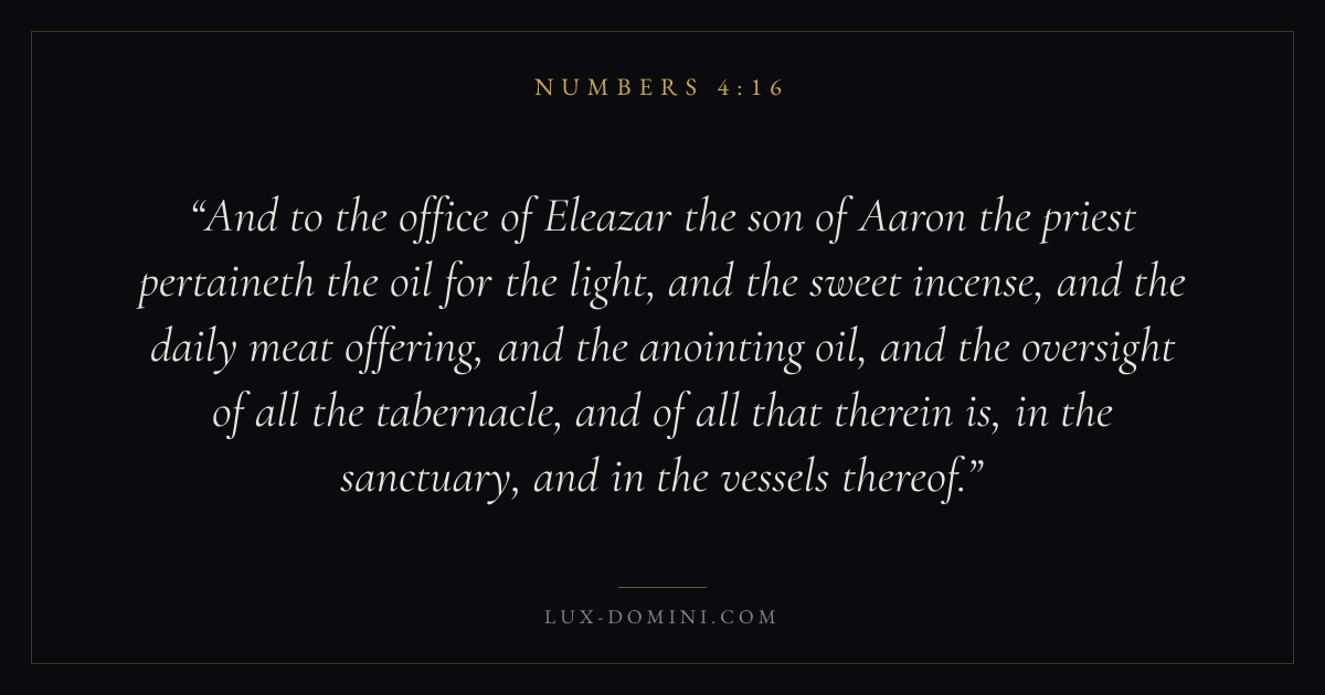 And to the office of Eleazar the son of Aaron the priest pertaineth the oil for the light, and the sweet incense, and the daily meat offering, and the anointing oil, and the oversight of all the tabernacle, and of all that therein is, in the sanctuary, and in the vessels thereof.
