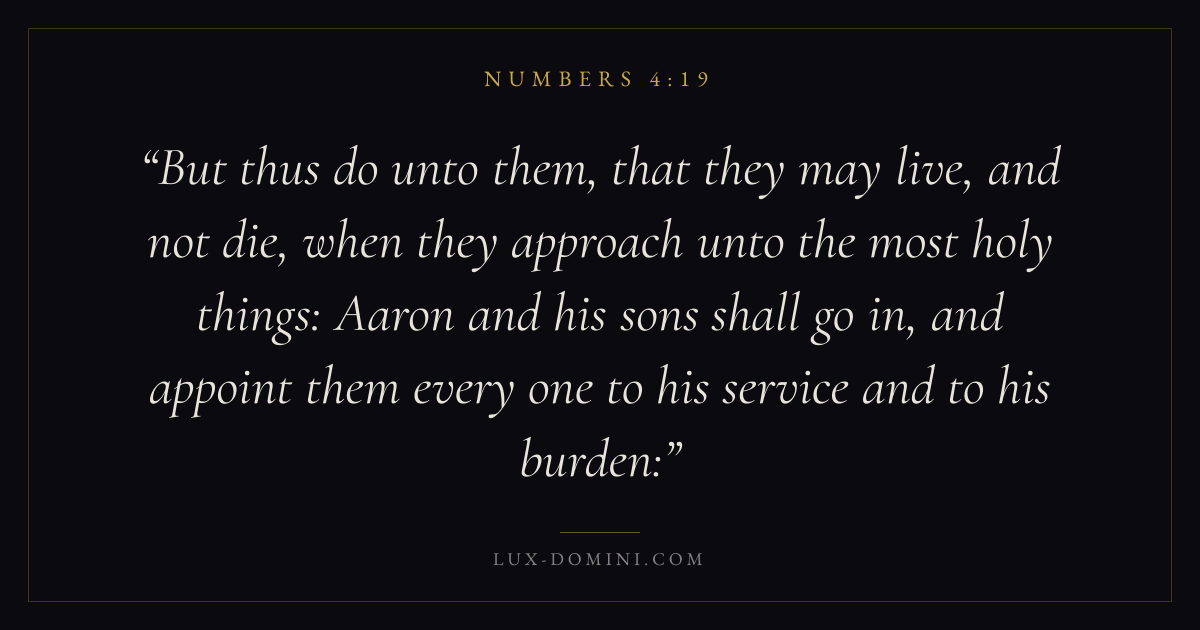 But thus do unto them, that they may live, and not die, when they approach unto the most holy things: Aaron and his sons shall go in, and appoint them every one to his service and to his burden:
