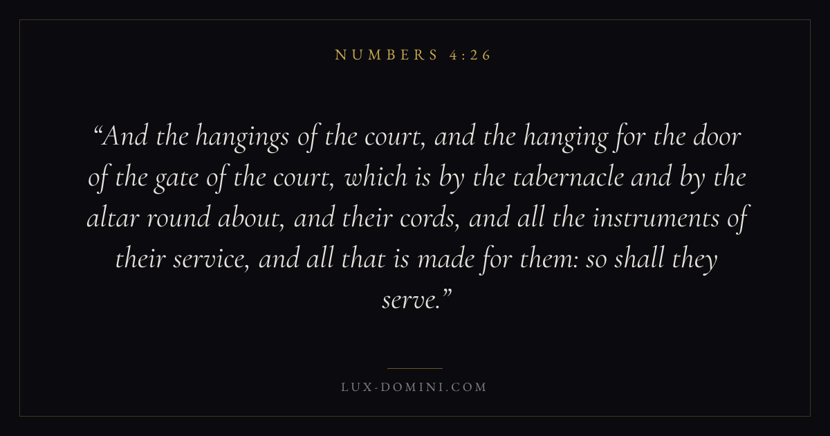 And the hangings of the court, and the hanging for the door of the gate of the court, which is by the tabernacle and by the altar round about, and their cords, and all the instruments of their service, and all that is made for them: so shall they serve.