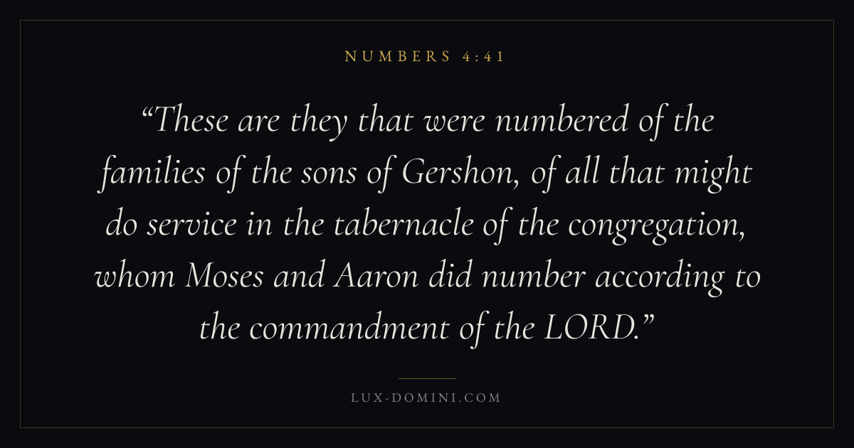 These are they that were numbered of the families of the sons of Gershon, of all that might do service in the tabernacle of the congregation, whom Moses and Aaron did number according to the commandment of the LORD.