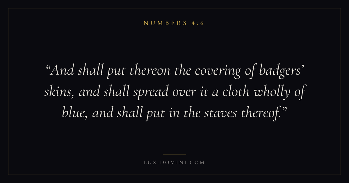 And shall put thereon the covering of badgers’ skins, and shall spread over it a cloth wholly of blue, and shall put in the staves thereof.