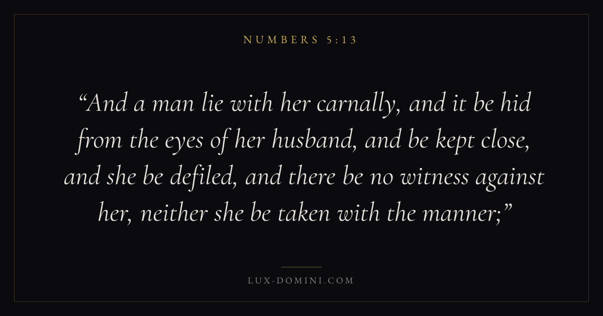 And a man lie with her carnally, and it be hid from the eyes of her husband, and be kept close, and she be defiled, and there be no witness against her, neither she be taken with the manner;