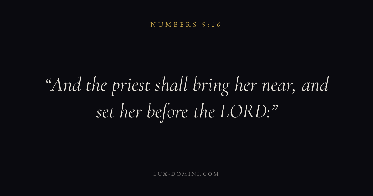 Books / Numbers / Chapter 5 / Verse 16 ← Numbers 5:15 Numbers 5:16 Numbers 5:17 → And the priest shall bring her near, and set her before the LORD: Download verse card Share on Twitter Share on Facebook Pin it ✦ Key themes Justice and mercyPilgrimageRebellionJudgment Read with Numbers 5:17Numbers 5:18Micah 6:8Amos 5:24 Related topics Bible verses about justice and mercy ✦ Numbers Chapter 5 verses V. 1 V. 2 V. 3 V. 4 V. 5 V. 6 V. 7 V. 8 V. 9 V. 10 V. 11 V. 12 V. 13 V. 14 V. 15 V. 16 V. 17 V. 18 V. 19 V. 20 V. 21 V. 22 V. 23 V. 24 V. 25 V. 26 V. 27 V. 28 V. 29 V. 30 V. 31