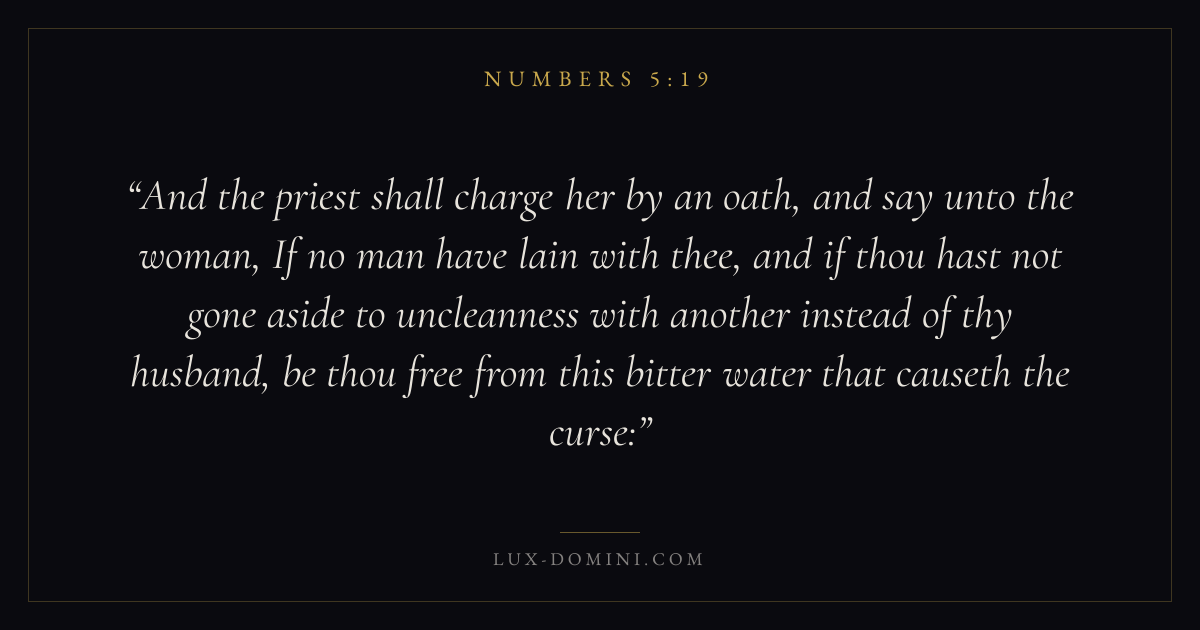 And the priest shall charge her by an oath, and say unto the woman, If no man have lain with thee, and if thou hast not gone aside to uncleanness with another instead of thy husband, be thou free from this bitter water that causeth the curse: