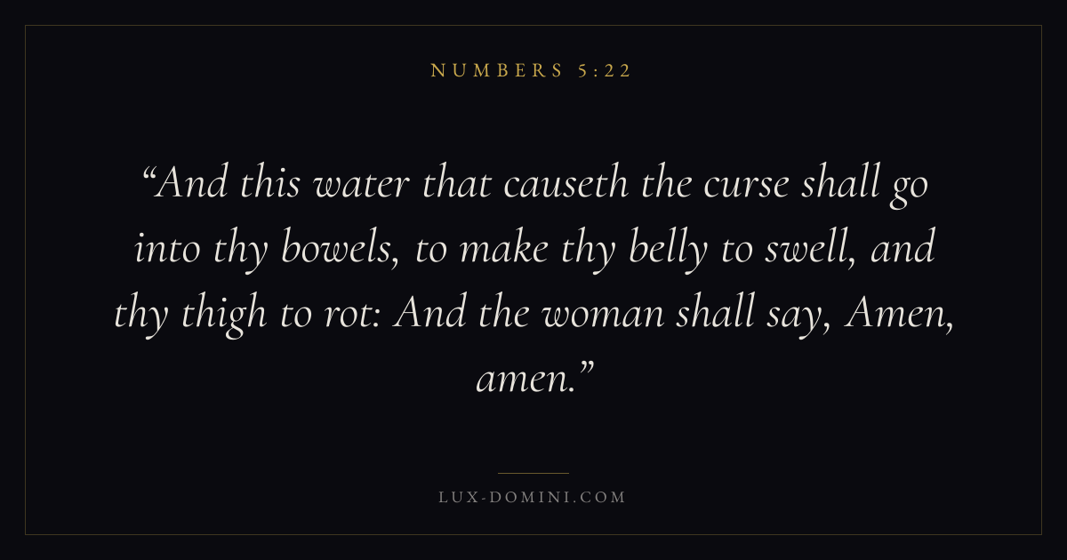 And this water that causeth the curse shall go into thy bowels, to make thy belly to swell, and thy thigh to rot: And the woman shall say, Amen, amen.