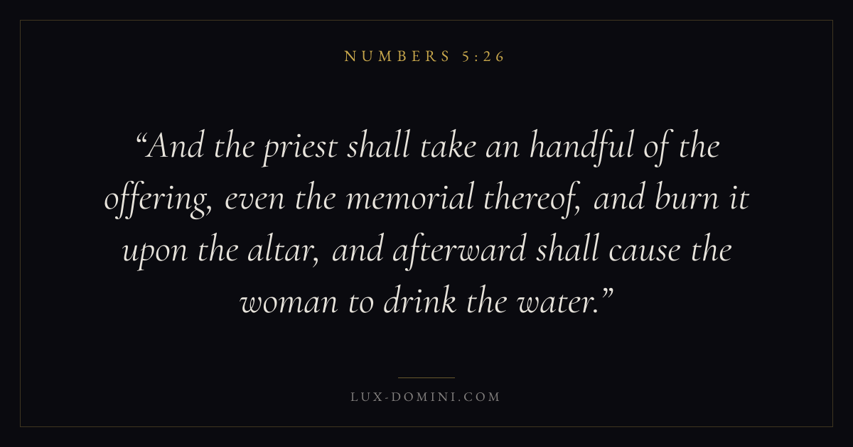 And the priest shall take an handful of the offering, even the memorial thereof, and burn it upon the altar, and afterward shall cause the woman to drink the water.