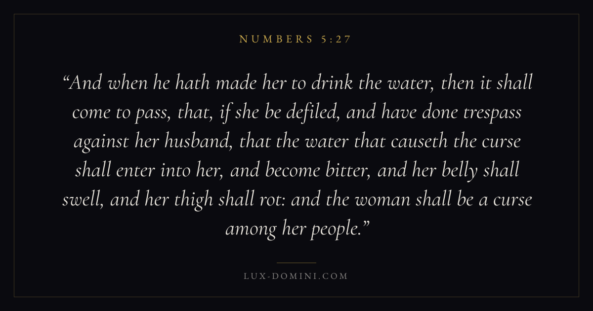 And when he hath made her to drink the water, then it shall come to pass, that, if she be defiled, and have done trespass against her husband, that the water that causeth the curse shall enter into her, and become bitter, and her belly shall swell, and her thigh shall rot: and the woman shall be a curse among her people.