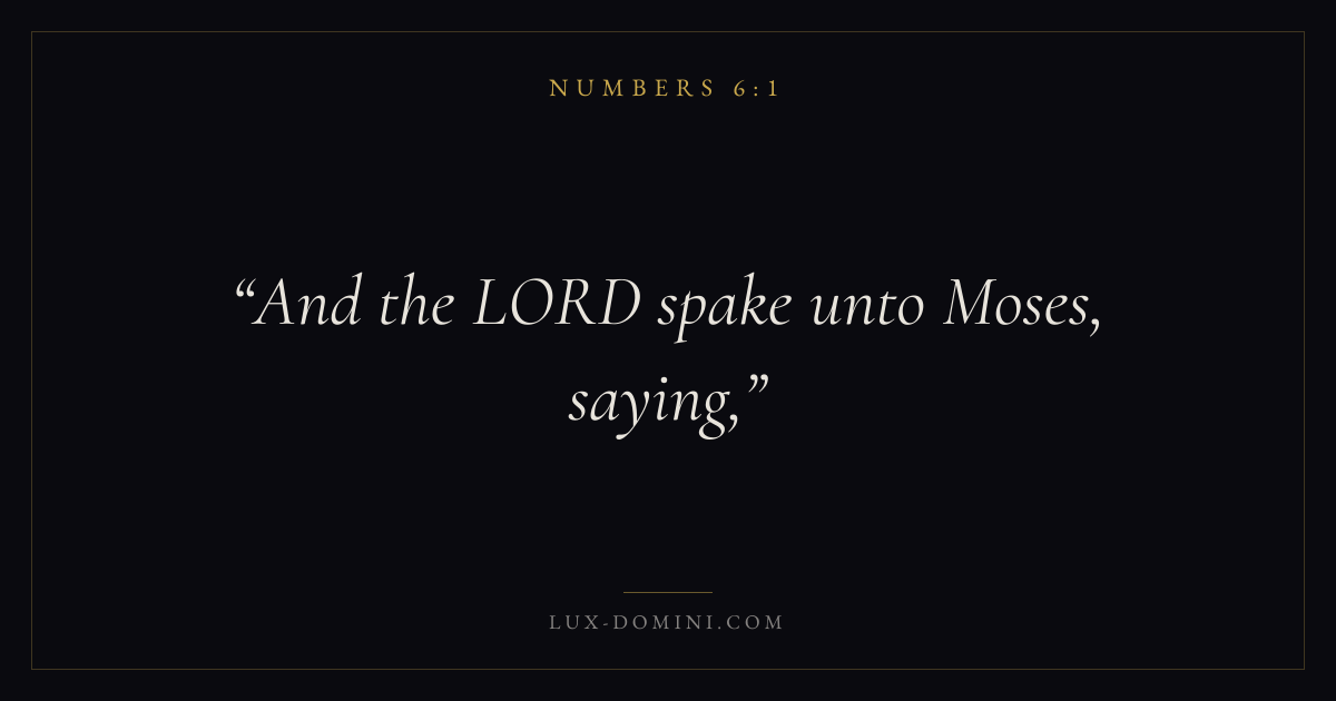 Books / Numbers / Chapter 6 / Verse 1 ← Numbers 5:31 Numbers 6:1 Numbers 6:2 → And the LORD spake unto Moses, saying, Download verse card Share on Twitter Share on Facebook Pin it ✦ Key themes Justice and mercyTruthPilgrimageRebellion Read with Numbers 6:2Numbers 6:3Micah 6:8Amos 5:24 Related topics Bible verses about justice and mercyBible verses about truth ✦ Numbers Chapter 6 verses V. 1 V. 2 V. 3 V. 4 V. 5 V. 6 V. 7 V. 8 V. 9 V. 10 V. 11 V. 12 V. 13 V. 14 V. 15 V. 16 V. 17 V. 18 V. 19 V. 20 V. 21 V. 22 V. 23 V. 24 V. 25 V. 26 V. 27