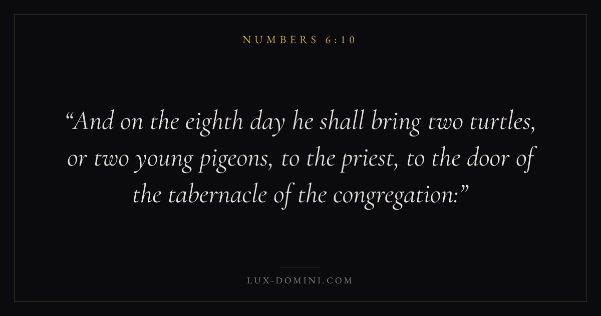 And on the eighth day he shall bring two turtles, or two young pigeons, to the priest, to the door of the tabernacle of the congregation: