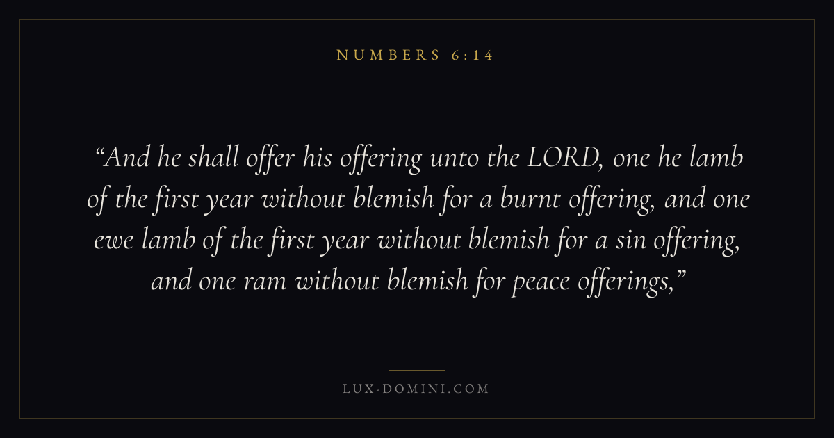 And he shall offer his offering unto the LORD, one he lamb of the first year without blemish for a burnt offering, and one ewe lamb of the first year without blemish for a sin offering, and one ram without blemish for peace offerings,