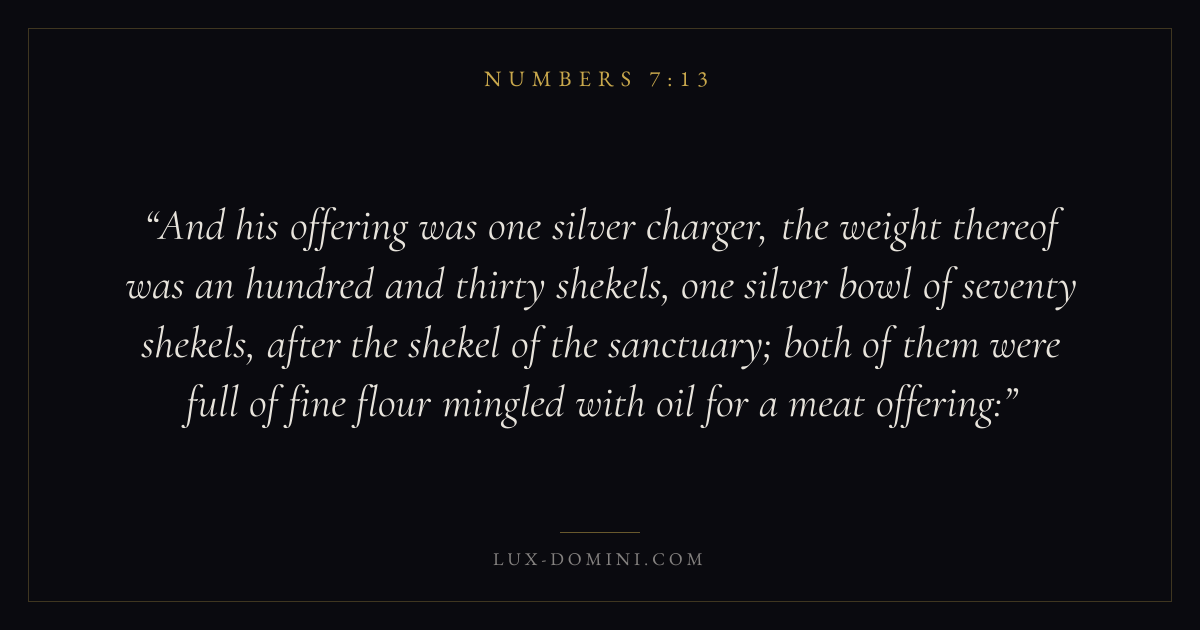 And his offering was one silver charger, the weight thereof was an hundred and thirty shekels, one silver bowl of seventy shekels, after the shekel of the sanctuary; both of them were full of fine flour mingled with oil for a meat offering:
