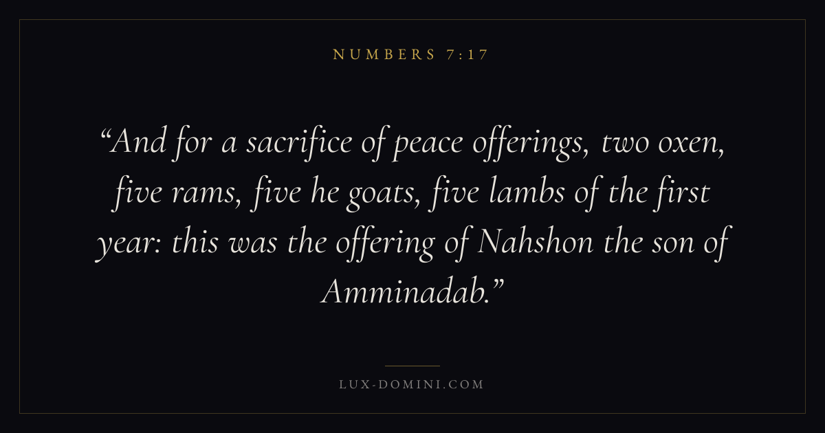 And for a sacrifice of peace offerings, two oxen, five rams, five he goats, five lambs of the first year: this was the offering of Nahshon the son of Amminadab.
