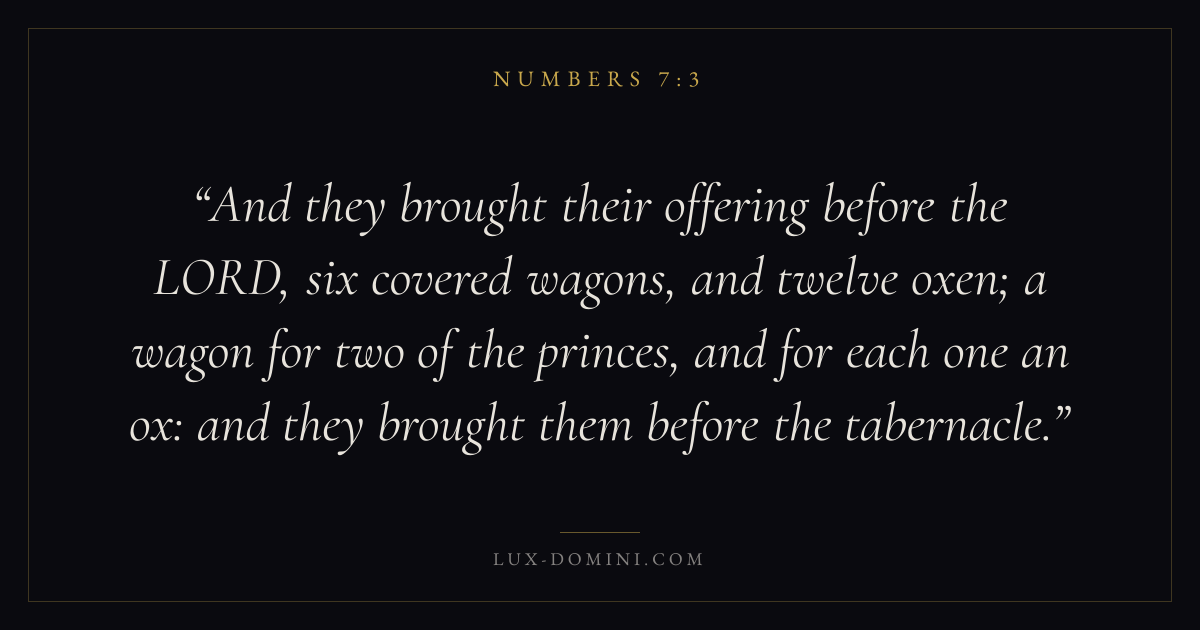 And they brought their offering before the LORD, six covered wagons, and twelve oxen; a wagon for two of the princes, and for each one an ox: and they brought them before the tabernacle.