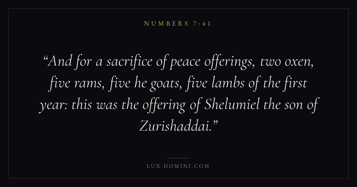 And for a sacrifice of peace offerings, two oxen, five rams, five he goats, five lambs of the first year: this was the offering of Shelumiel the son of Zurishaddai.