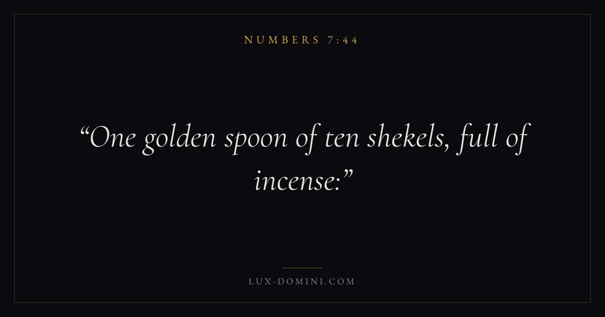 Books / Numbers / Chapter 7 / Verse 44 ← Numbers 7:43 Numbers 7:44 Numbers 7:45 → One golden spoon of ten shekels, full of incense: Download verse card Share on Twitter Share on Facebook Pin it ✦ Key themes Justice and mercyPilgrimageRebellionJudgment Read with Numbers 7:42Numbers 7:43Micah 6:8Amos 5:24 Related topics Bible verses about justice and mercy ✦ Numbers Chapter 7 verses V. 1 V. 2 V. 3 V. 4 V. 5 V. 6 V. 7 V. 8 V. 9 V. 10 V. 11 V. 12 V. 13 V. 14 V. 15 V. 16 V. 17 V. 18 V. 19 V. 20 V. 21 V. 22 V. 23 V. 24 V. 25 V. 26 V. 27 V. 28 V. 29 V. 30 V. 31 V. 32 V. 33 V. 34 V. 35 V. 36 V. 37 V. 38 V. 39 V. 40 V. 41 V. 42 V. 43 V. 44 V. 45 V. 46 V. 47 V. 48 V. 49 V. 50 V. 51 V. 52 V. 53 V. 54 V. 55 V. 56 V. 57 V. 58 V. 59 V. 60 V. 61 V. 62 V. 63 V. 64 V. 65 V. 66 V. 67 V. 68 V. 69 V. 70 V. 71 V. 72 V. 73 V. 74 V. 75 V. 76 V. 77 V. 78 V. 79 V. 80 V. 81 V. 82 V. 83 V. 84 V. 85 V. 86 V. 87 V. 88 V. 89