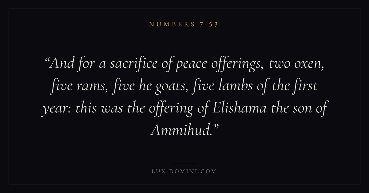 And for a sacrifice of peace offerings, two oxen, five rams, five he goats, five lambs of the first year: this was the offering of Elishama the son of Ammihud.