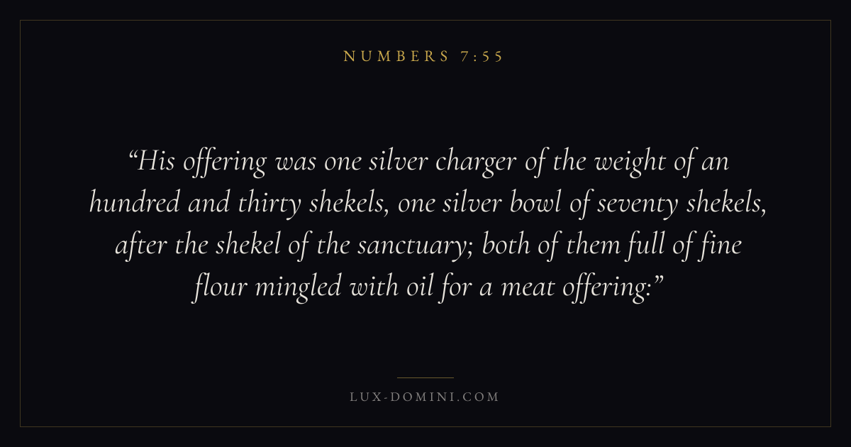 His offering was one silver charger of the weight of an hundred and thirty shekels, one silver bowl of seventy shekels, after the shekel of the sanctuary; both of them full of fine flour mingled with oil for a meat offering: