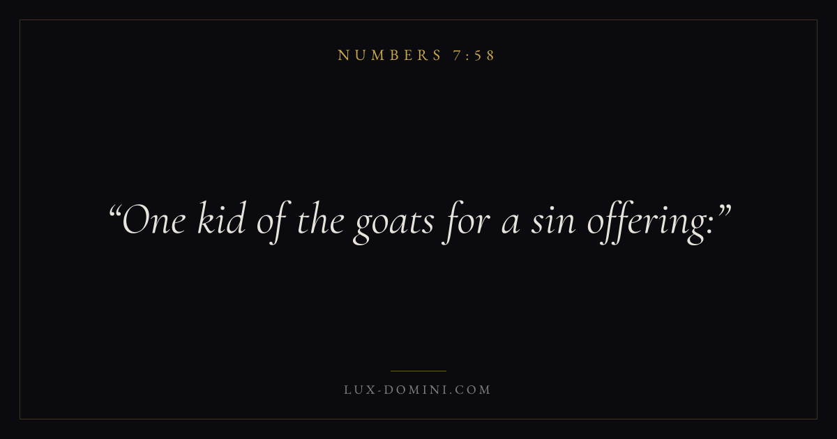 Books / Numbers / Chapter 7 / Verse 58 ← Numbers 7:57 Numbers 7:58 Numbers 7:59 → One kid of the goats for a sin offering: Download verse card Share on Twitter Share on Facebook Pin it ✦ Key themes Justice and mercyPilgrimageRebellionJudgment Read with Numbers 7:54Numbers 7:55Micah 6:8Amos 5:24 Related topics Bible verses about justice and mercy ✦ Numbers Chapter 7 verses V. 1 V. 2 V. 3 V. 4 V. 5 V. 6 V. 7 V. 8 V. 9 V. 10 V. 11 V. 12 V. 13 V. 14 V. 15 V. 16 V. 17 V. 18 V. 19 V. 20 V. 21 V. 22 V. 23 V. 24 V. 25 V. 26 V. 27 V. 28 V. 29 V. 30 V. 31 V. 32 V. 33 V. 34 V. 35 V. 36 V. 37 V. 38 V. 39 V. 40 V. 41 V. 42 V. 43 V. 44 V. 45 V. 46 V. 47 V. 48 V. 49 V. 50 V. 51 V. 52 V. 53 V. 54 V. 55 V. 56 V. 57 V. 58 V. 59 V. 60 V. 61 V. 62 V. 63 V. 64 V. 65 V. 66 V. 67 V. 68 V. 69 V. 70 V. 71 V. 72 V. 73 V. 74 V. 75 V. 76 V. 77 V. 78 V. 79 V. 80 V. 81 V. 82 V. 83 V. 84 V. 85 V. 86 V. 87 V. 88 V. 89