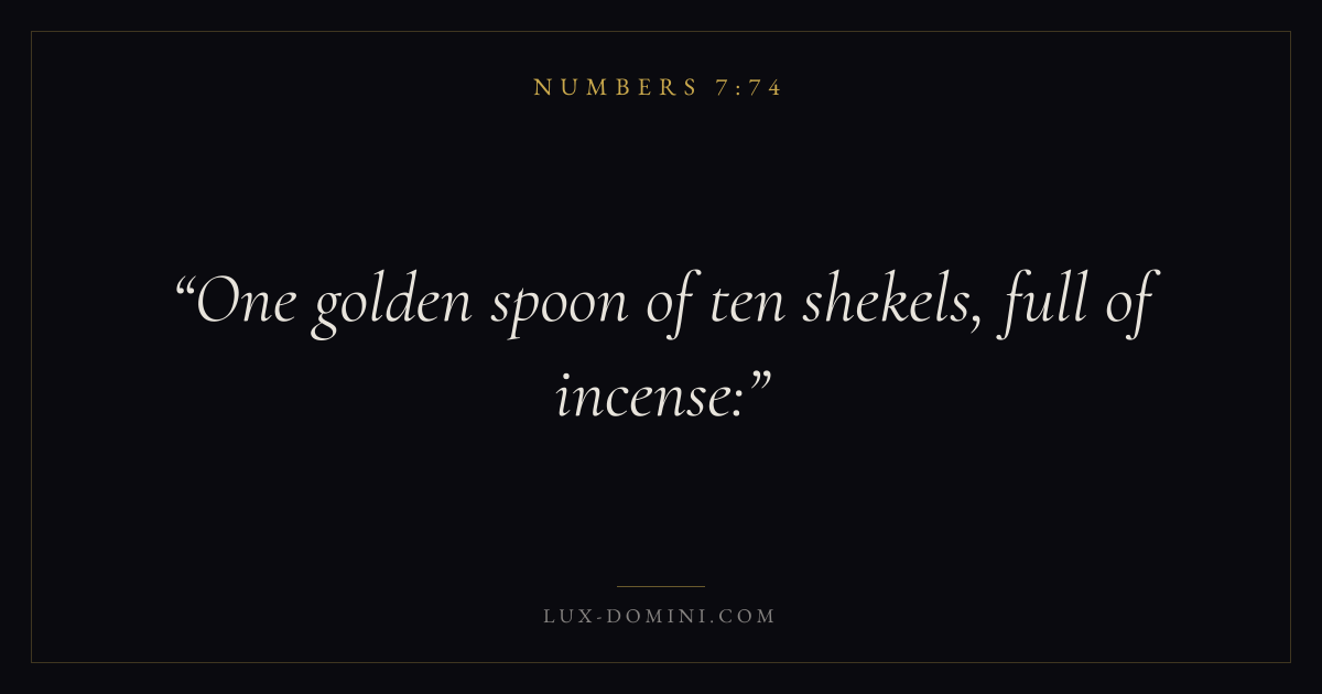 Books / Numbers / Chapter 7 / Verse 74 ← Numbers 7:73 Numbers 7:74 Numbers 7:75 → One golden spoon of ten shekels, full of incense: Download verse card Share on Twitter Share on Facebook Pin it ✦ Key themes Justice and mercyPilgrimageRebellionJudgment Read with Numbers 7:72Numbers 7:73Micah 6:8Amos 5:24 Related topics Bible verses about justice and mercy ✦ Numbers Chapter 7 verses V. 1 V. 2 V. 3 V. 4 V. 5 V. 6 V. 7 V. 8 V. 9 V. 10 V. 11 V. 12 V. 13 V. 14 V. 15 V. 16 V. 17 V. 18 V. 19 V. 20 V. 21 V. 22 V. 23 V. 24 V. 25 V. 26 V. 27 V. 28 V. 29 V. 30 V. 31 V. 32 V. 33 V. 34 V. 35 V. 36 V. 37 V. 38 V. 39 V. 40 V. 41 V. 42 V. 43 V. 44 V. 45 V. 46 V. 47 V. 48 V. 49 V. 50 V. 51 V. 52 V. 53 V. 54 V. 55 V. 56 V. 57 V. 58 V. 59 V. 60 V. 61 V. 62 V. 63 V. 64 V. 65 V. 66 V. 67 V. 68 V. 69 V. 70 V. 71 V. 72 V. 73 V. 74 V. 75 V. 76 V. 77 V. 78 V. 79 V. 80 V. 81 V. 82 V. 83 V. 84 V. 85 V. 86 V. 87 V. 88 V. 89
