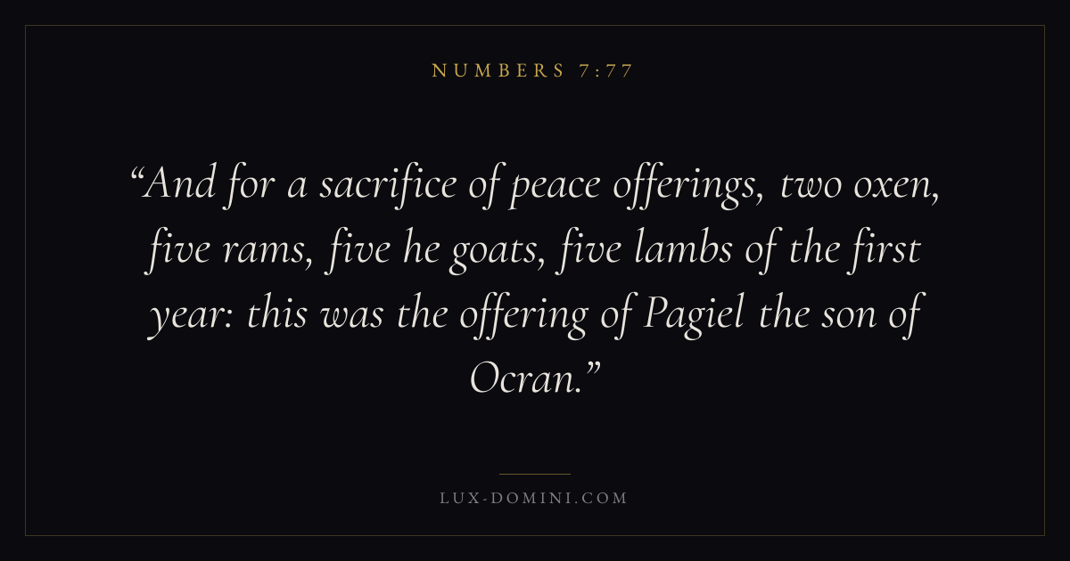 And for a sacrifice of peace offerings, two oxen, five rams, five he goats, five lambs of the first year: this was the offering of Pagiel the son of Ocran.