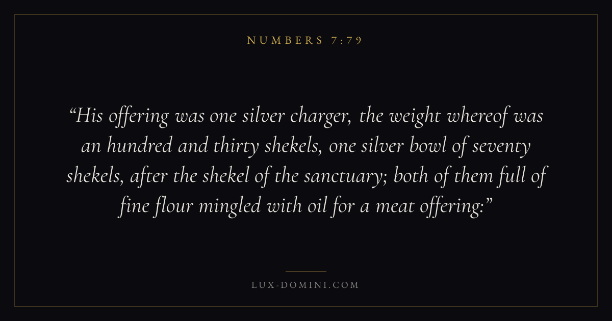 His offering was one silver charger, the weight whereof was an hundred and thirty shekels, one silver bowl of seventy shekels, after the shekel of the sanctuary; both of them full of fine flour mingled with oil for a meat offering: