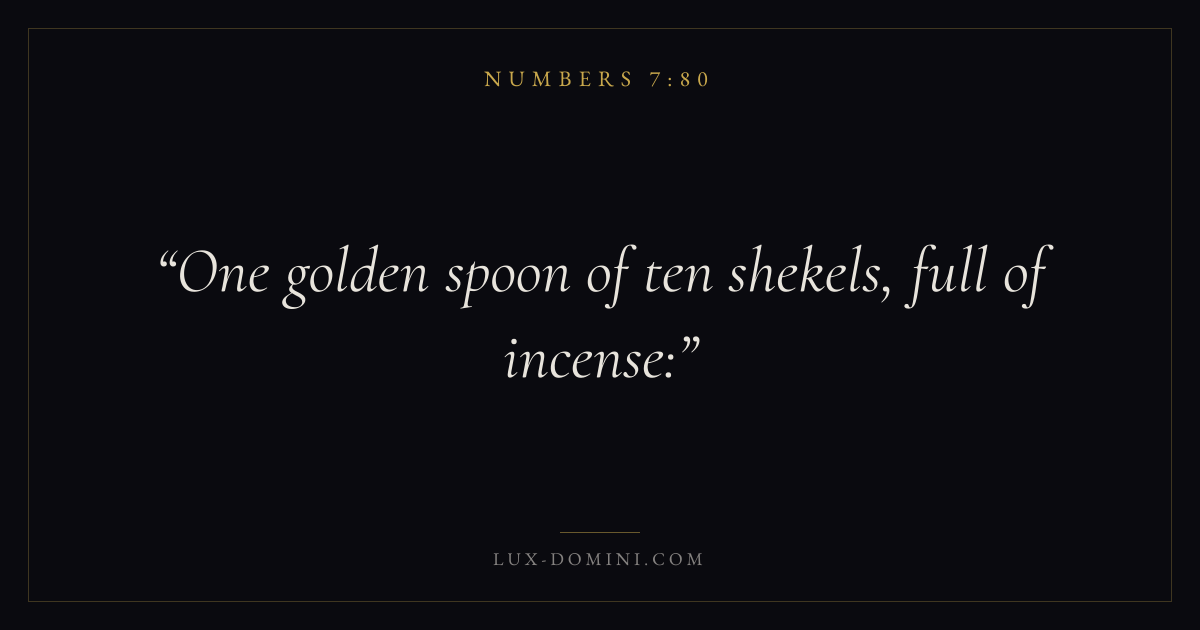 Books / Numbers / Chapter 7 / Verse 80 ← Numbers 7:79 Numbers 7:80 Numbers 7:81 → One golden spoon of ten shekels, full of incense: Download verse card Share on Twitter Share on Facebook Pin it ✦ Key themes Justice and mercyPilgrimageRebellionJudgment Read with Numbers 7:78Numbers 7:79Micah 6:8Amos 5:24 Related topics Bible verses about justice and mercy ✦ Numbers Chapter 7 verses V. 1 V. 2 V. 3 V. 4 V. 5 V. 6 V. 7 V. 8 V. 9 V. 10 V. 11 V. 12 V. 13 V. 14 V. 15 V. 16 V. 17 V. 18 V. 19 V. 20 V. 21 V. 22 V. 23 V. 24 V. 25 V. 26 V. 27 V. 28 V. 29 V. 30 V. 31 V. 32 V. 33 V. 34 V. 35 V. 36 V. 37 V. 38 V. 39 V. 40 V. 41 V. 42 V. 43 V. 44 V. 45 V. 46 V. 47 V. 48 V. 49 V. 50 V. 51 V. 52 V. 53 V. 54 V. 55 V. 56 V. 57 V. 58 V. 59 V. 60 V. 61 V. 62 V. 63 V. 64 V. 65 V. 66 V. 67 V. 68 V. 69 V. 70 V. 71 V. 72 V. 73 V. 74 V. 75 V. 76 V. 77 V. 78 V. 79 V. 80 V. 81 V. 82 V. 83 V. 84 V. 85 V. 86 V. 87 V. 88 V. 89