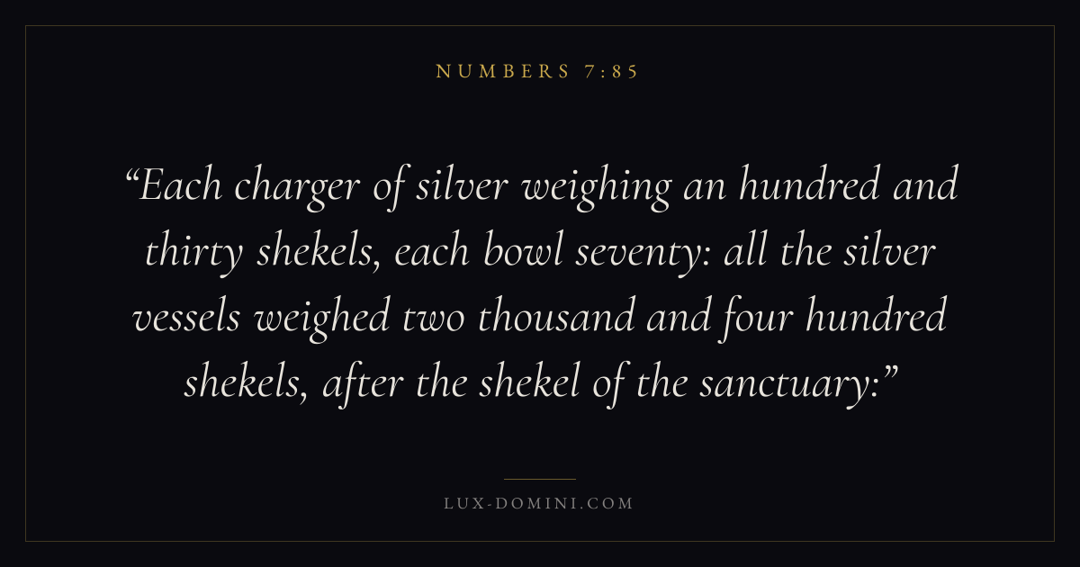 Each charger of silver weighing an hundred and thirty shekels, each bowl seventy: all the silver vessels weighed two thousand and four hundred shekels, after the shekel of the sanctuary: