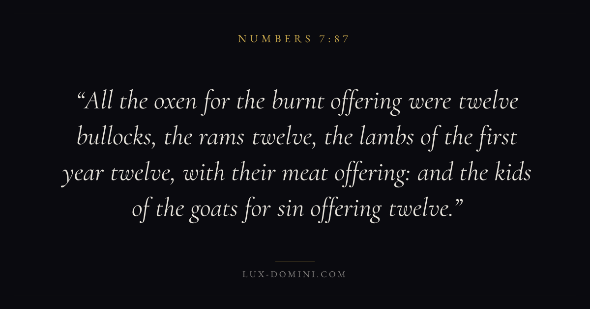 All the oxen for the burnt offering were twelve bullocks, the rams twelve, the lambs of the first year twelve, with their meat offering: and the kids of the goats for sin offering twelve.