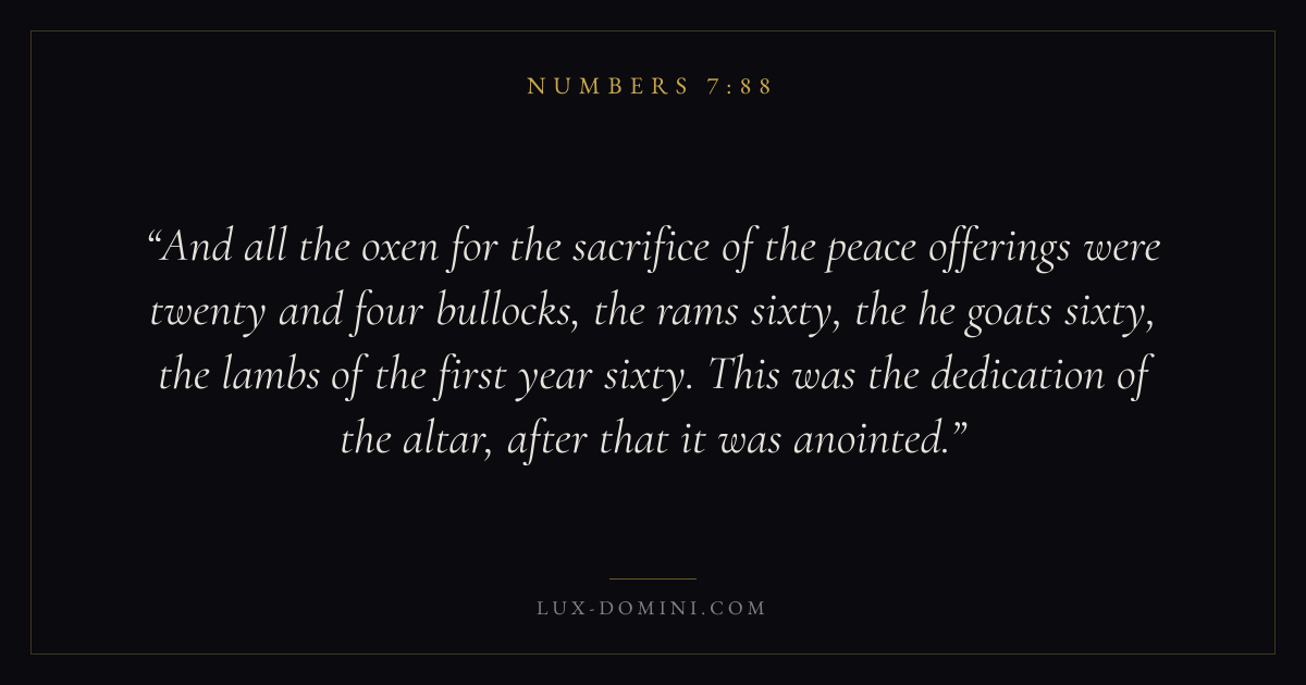 And all the oxen for the sacrifice of the peace offerings were twenty and four bullocks, the rams sixty, the he goats sixty, the lambs of the first year sixty. This was the dedication of the altar, after that it was anointed.