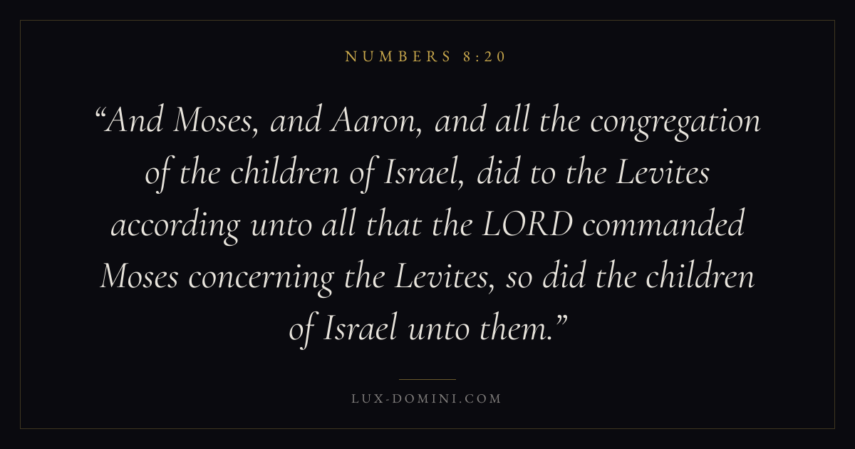And Moses, and Aaron, and all the congregation of the children of Israel, did to the Levites according unto all that the LORD commanded Moses concerning the Levites, so did the children of Israel unto them.