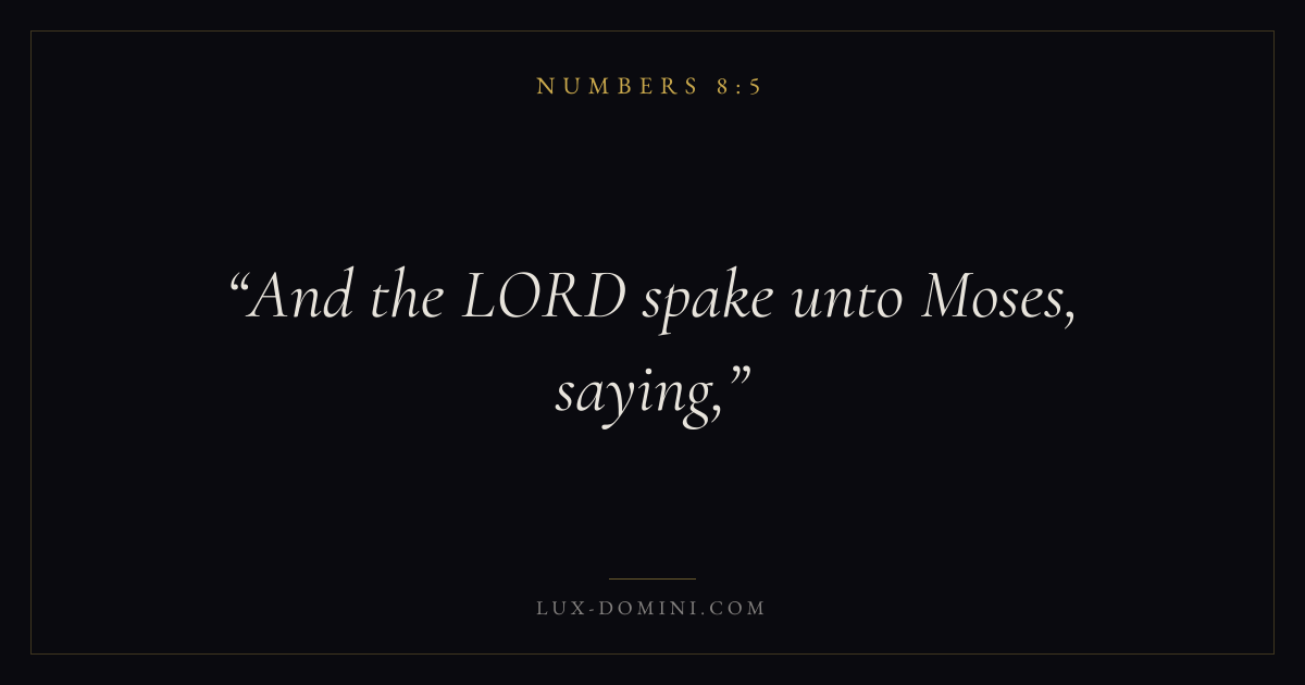 Books / Numbers / Chapter 8 / Verse 5 ← Numbers 8:4 Numbers 8:5 Numbers 8:6 → And the LORD spake unto Moses, saying, Download verse card Share on Twitter Share on Facebook Pin it ✦ Key themes Justice and mercyPilgrimageRebellionJudgment Read with Numbers 8:6Numbers 8:7Micah 6:8Amos 5:24 Related topics Bible verses about justice and mercy ✦ Numbers Chapter 8 verses V. 1 V. 2 V. 3 V. 4 V. 5 V. 6 V. 7 V. 8 V. 9 V. 10 V. 11 V. 12 V. 13 V. 14 V. 15 V. 16 V. 17 V. 18 V. 19 V. 20 V. 21 V. 22 V. 23 V. 24 V. 25 V. 26