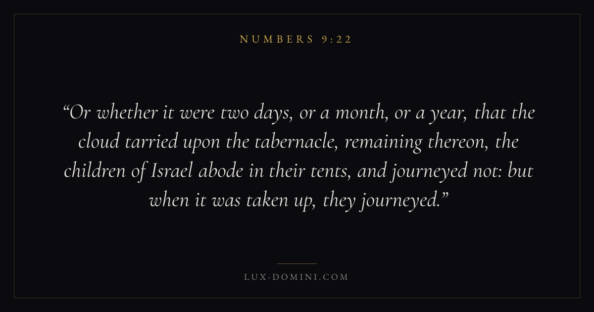 Or whether it were two days, or a month, or a year, that the cloud tarried upon the tabernacle, remaining thereon, the children of Israel abode in their tents, and journeyed not: but when it was taken up, they journeyed.