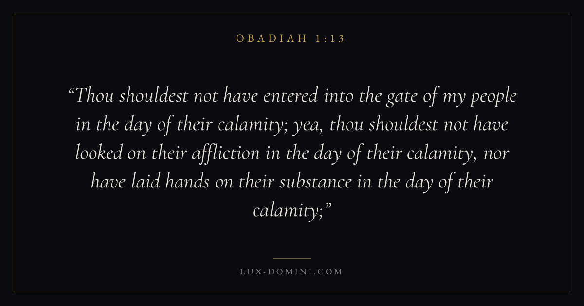 Thou shouldest not have entered into the gate of my people in the day of their calamity; yea, thou shouldest not have looked on their affliction in the day of their calamity, nor have laid hands on their substance in the day of their calamity;