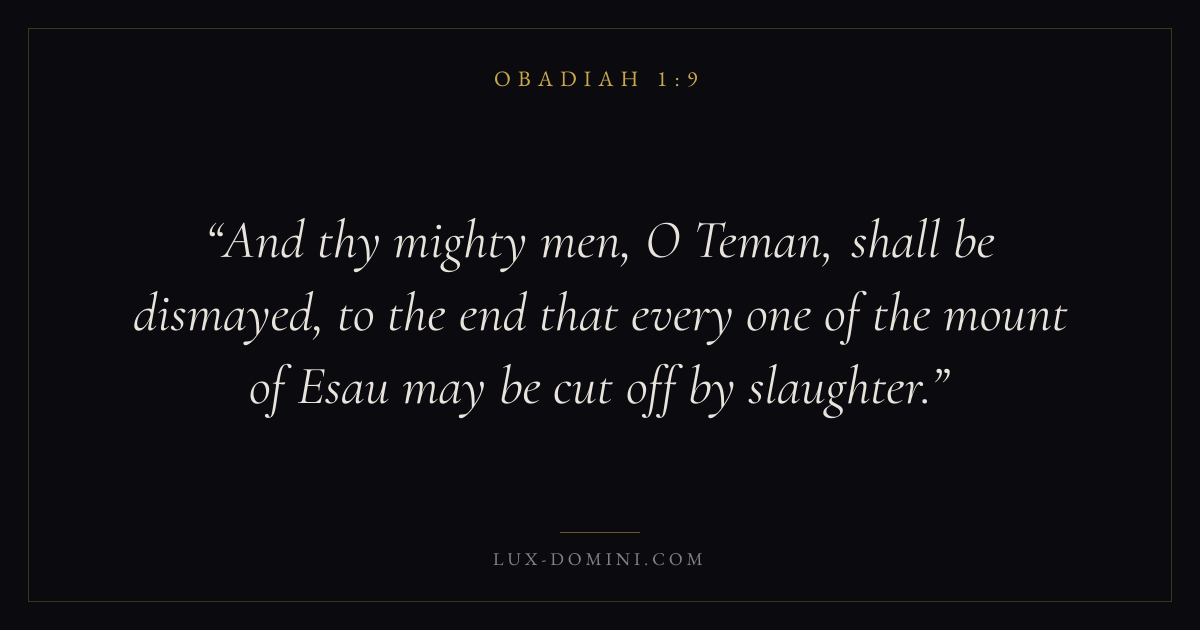 And thy mighty men, O Teman, shall be dismayed, to the end that every one of the mount of Esau may be cut off by slaughter.