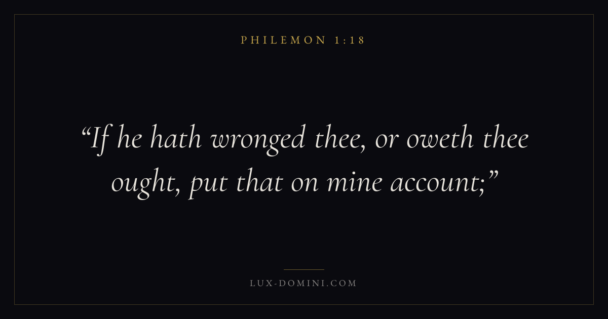 Books / Philemon / Chapter 1 / Verse 18 ← Philemon 1:17 Philemon 1:18 Philemon 1:19 → If he hath wronged thee, or oweth thee ought, put that on mine account; Download verse card Share on Twitter Share on Facebook Pin it ✦ Key themes GraceReconciliationBrotherhoodFreedom Read with Philemon 1:19Philemon 1:20Ephesians 2:82 Corinthians 12:9 Related topics Bible verses about grace ✦ Philemon Chapter 1 verses V. 1 V. 2 V. 3 V. 4 V. 5 V. 6 V. 7 V. 8 V. 9 V. 10 V. 11 V. 12 V. 13 V. 14 V. 15 V. 16 V. 17 V. 18 V. 19 V. 20 V. 21 V. 22 V. 23 V. 24 V. 25