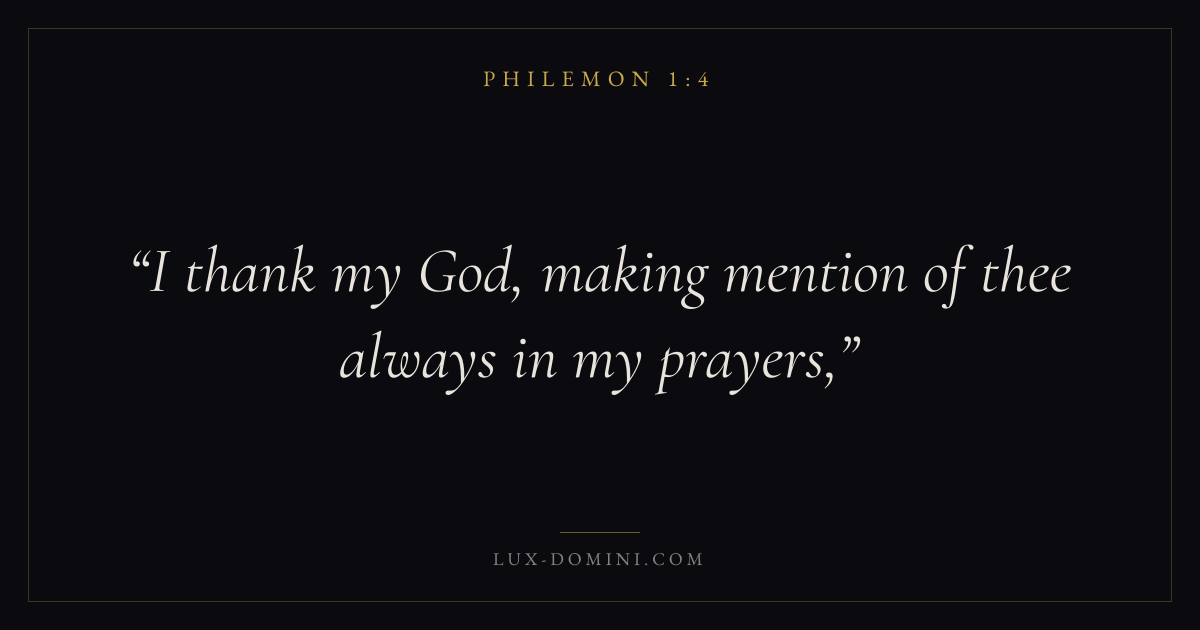 Books / Philemon / Chapter 1 / Verse 4 ← Philemon 1:3 Philemon 1:4 Philemon 1:5 → I thank my God, making mention of thee always in my prayers, Download verse card Share on Twitter Share on Facebook Pin it ✦ Key themes LoveFaithGraceReconciliation Read with Philemon 1:5Philemon 1:6John 3:161 Corinthians 13:4 Related topics Bible verses about loveBible verses about faithBible verses about grace ✦ Philemon Chapter 1 verses V. 1 V. 2 V. 3 V. 4 V. 5 V. 6 V. 7 V. 8 V. 9 V. 10 V. 11 V. 12 V. 13 V. 14 V. 15 V. 16 V. 17 V. 18 V. 19 V. 20 V. 21 V. 22 V. 23 V. 24 V. 25
