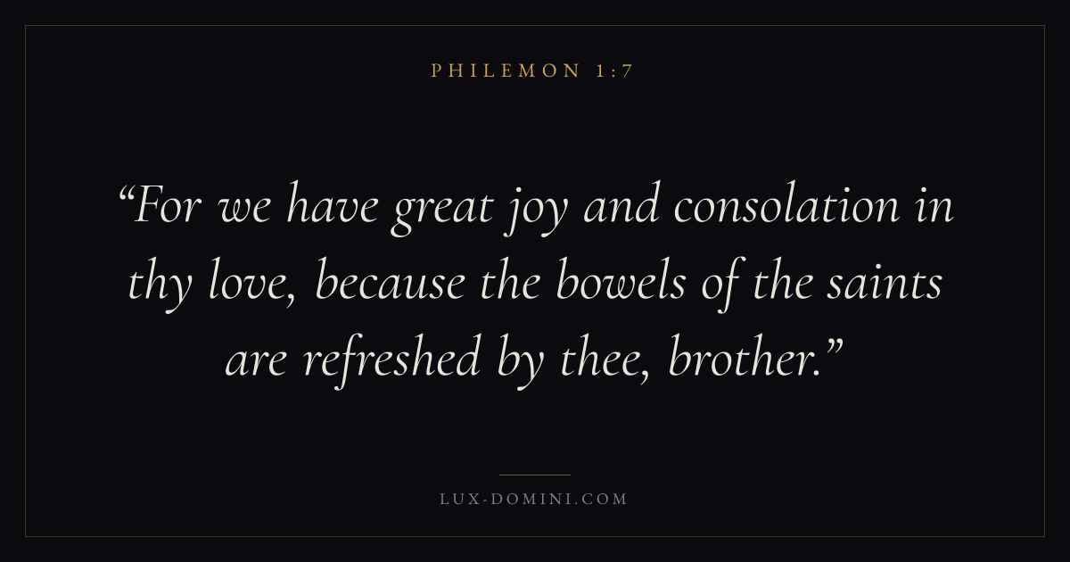 For we have great joy and consolation in thy love, because the bowels of the saints are refreshed by thee, brother.