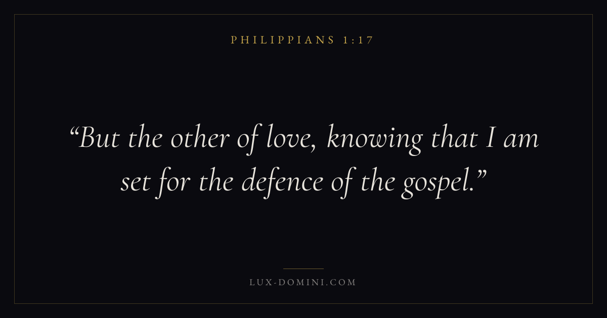 Books / Philippians / Chapter 1 / Verse 17 ← Philippians 1:16 Philippians 1:17 Philippians 1:18 → But the other of love, knowing that I am set for the defence of the gospel. Download verse card Share on Twitter Share on Facebook Pin it ✦ Key themes LoveHopeSuffering and trialsWisdomJoy Read with Philippians 1:15Philippians 1:16John 3:161 Corinthians 13:4 Related topics Bible verses about loveBible verses about hopeBible verses about suffering and trialsBible verses about wisdom ✦ Philippians Chapter 1 verses V. 1 V. 2 V. 3 V. 4 V. 5 V. 6 V. 7 V. 8 V. 9 V. 10 V. 11 V. 12 V. 13 V. 14 V. 15 V. 16 V. 17 V. 18 V. 19 V. 20 V. 21 V. 22 V. 23 V. 24 V. 25 V. 26 V. 27 V. 28 V. 29 V. 30