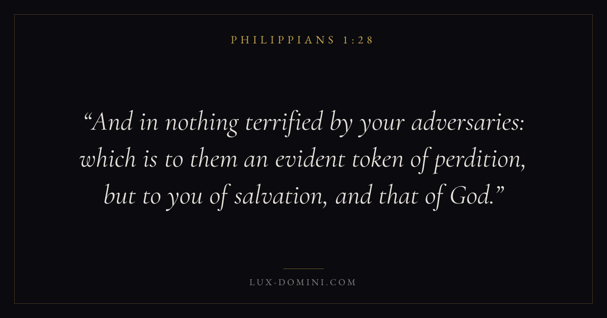 And in nothing terrified by your adversaries: which is to them an evident token of perdition, but to you of salvation, and that of God.