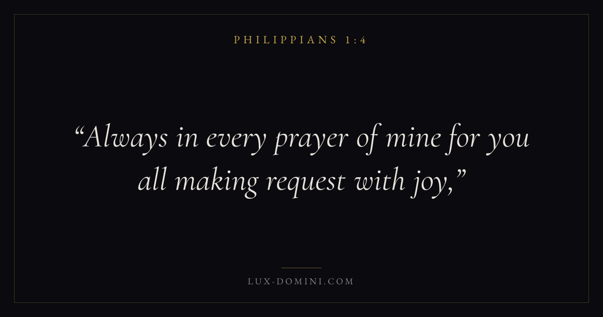 Books / Philippians / Chapter 1 / Verse 4 ← Philippians 1:3 Philippians 1:4 Philippians 1:5 → Always in every prayer of mine for you all making request with joy, Download verse card Share on Twitter Share on Facebook Pin it ✦ Key themes HopeSuffering and trialsPrayerHumilityJoy Read with Philippians 1:3Philippians 1:5Romans 8:24Revelation 21:4 Related topics Bible verses about hopeBible verses about suffering and trialsBible verses about prayerBible verses about humility ✦ Philippians Chapter 1 verses V. 1 V. 2 V. 3 V. 4 V. 5 V. 6 V. 7 V. 8 V. 9 V. 10 V. 11 V. 12 V. 13 V. 14 V. 15 V. 16 V. 17 V. 18 V. 19 V. 20 V. 21 V. 22 V. 23 V. 24 V. 25 V. 26 V. 27 V. 28 V. 29 V. 30