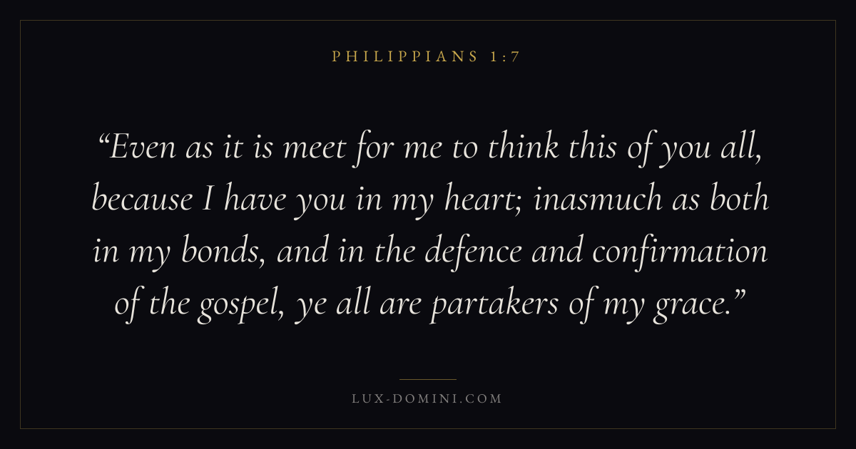 Even as it is meet for me to think this of you all, because I have you in my heart; inasmuch as both in my bonds, and in the defence and confirmation of the gospel, ye all are partakers of my grace.