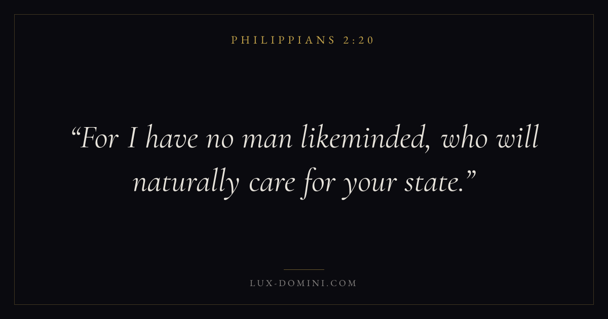 Books / Philippians / Chapter 2 / Verse 20 ← Philippians 2:19 Philippians 2:20 Philippians 2:21 → For I have no man likeminded, who will naturally care for your state. Download verse card Share on Twitter Share on Facebook Pin it ✦ Key themes HopeSuffering and trialsHumilityJoy Read with Philippians 2:19Philippians 2:21Romans 8:24Revelation 21:4 Related topics Bible verses about hopeBible verses about suffering and trialsBible verses about humility ✦ Philippians Chapter 2 verses V. 1 V. 2 V. 3 V. 4 V. 5 V. 6 V. 7 V. 8 V. 9 V. 10 V. 11 V. 12 V. 13 V. 14 V. 15 V. 16 V. 17 V. 18 V. 19 V. 20 V. 21 V. 22 V. 23 V. 24 V. 25 V. 26 V. 27 V. 28 V. 29 V. 30